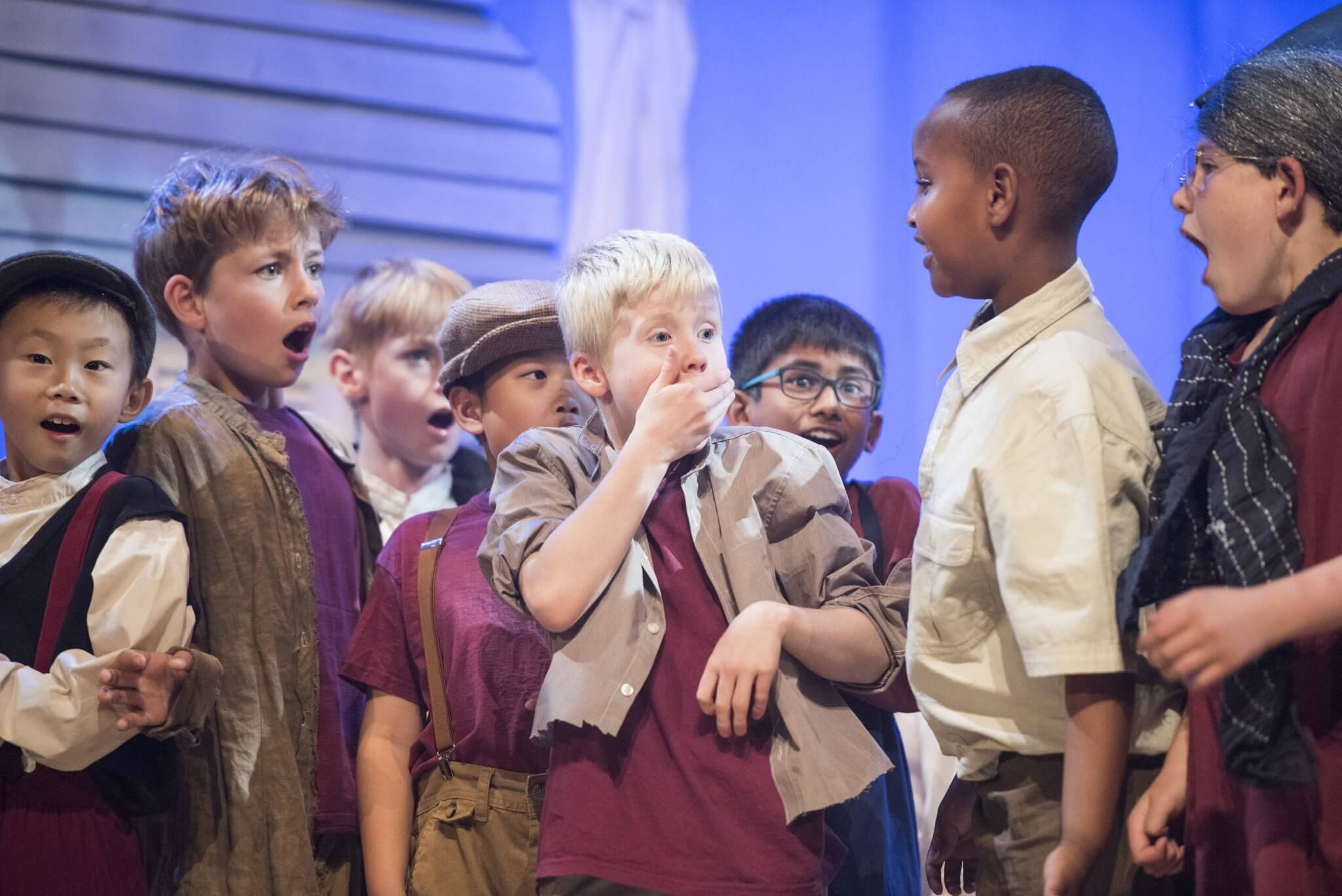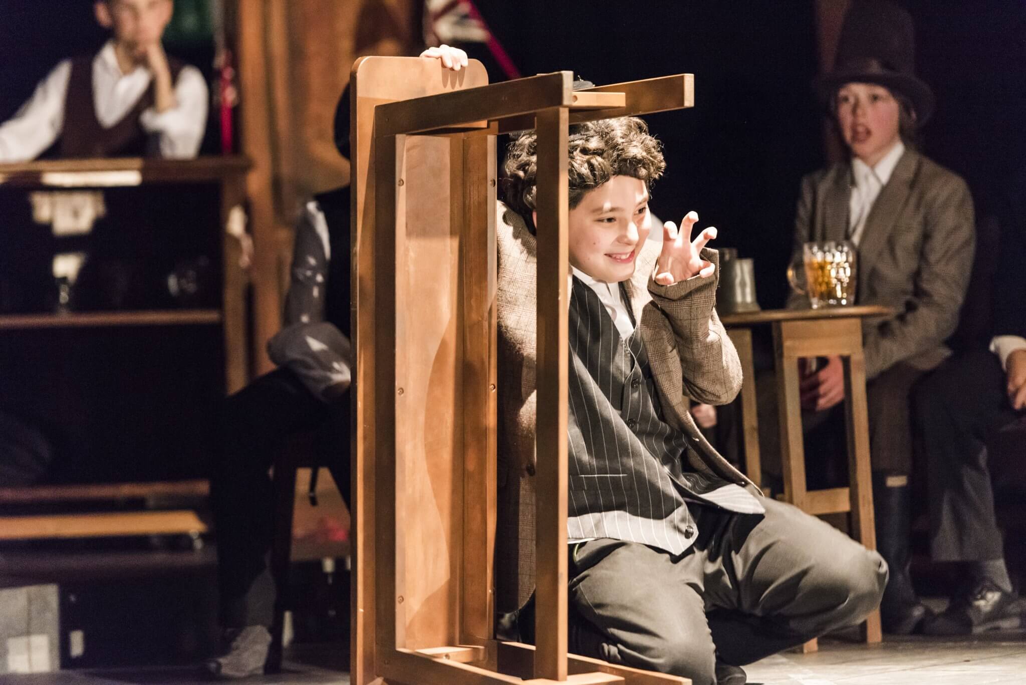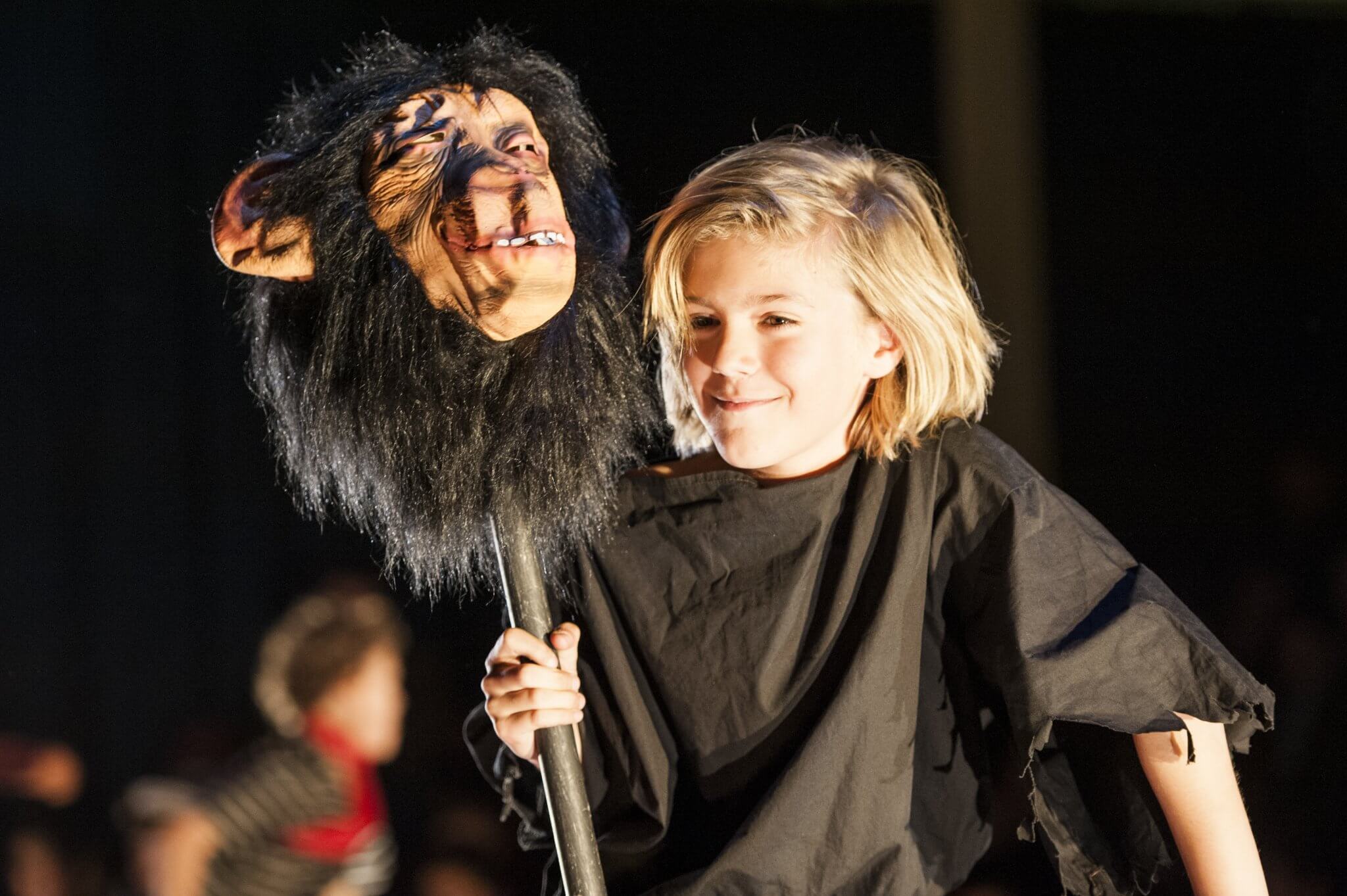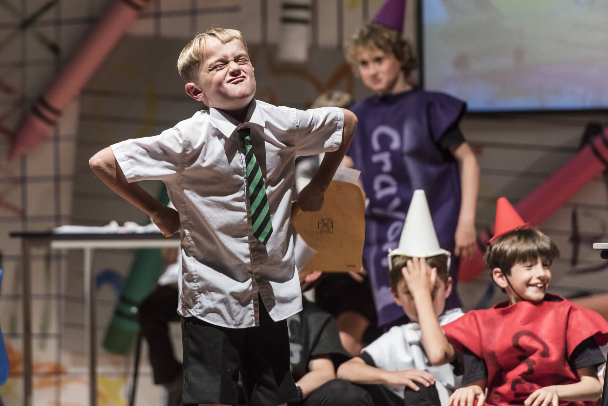 Providing a creative platform and a safe, constructive environment, the First and Second Years benefit from a weekly timetabled lesson. Here they engage with a wide range of topics, dramatists and styles including clowning, mime, ensemble and Shakespeare. One term is set aside for the rehearsal of a production in which the whole year takes part: the Upper First and Upper Second plays as well as the highly-anticipated Lower Second Playwriting Competition. Each year there is an exciting collaboration to look forward to, in which everyone has a part to play. These opportunities are further enhanced by working alongside industry professionals: playwrights and designers who provide outstanding sets and scripts for the pupils.